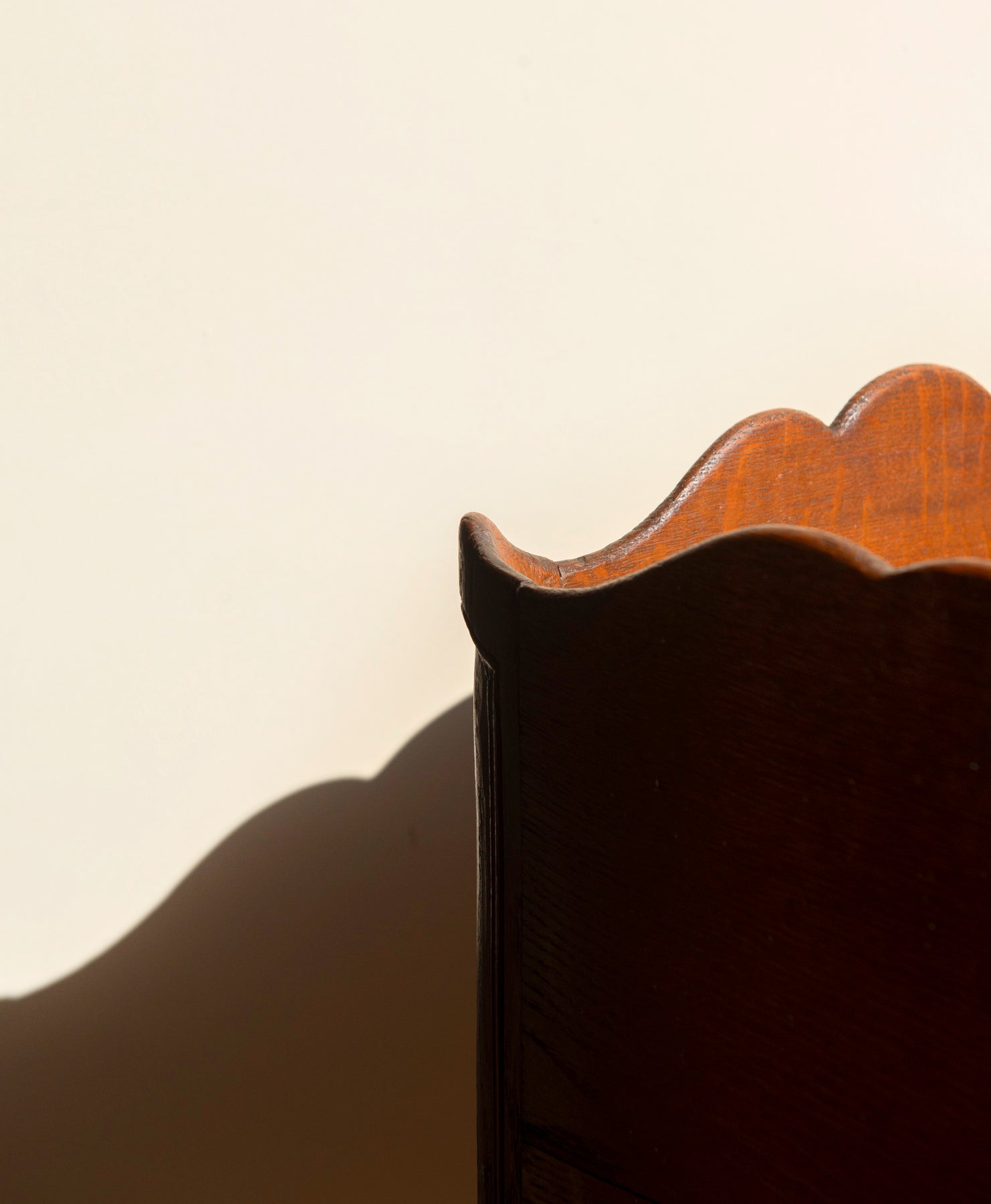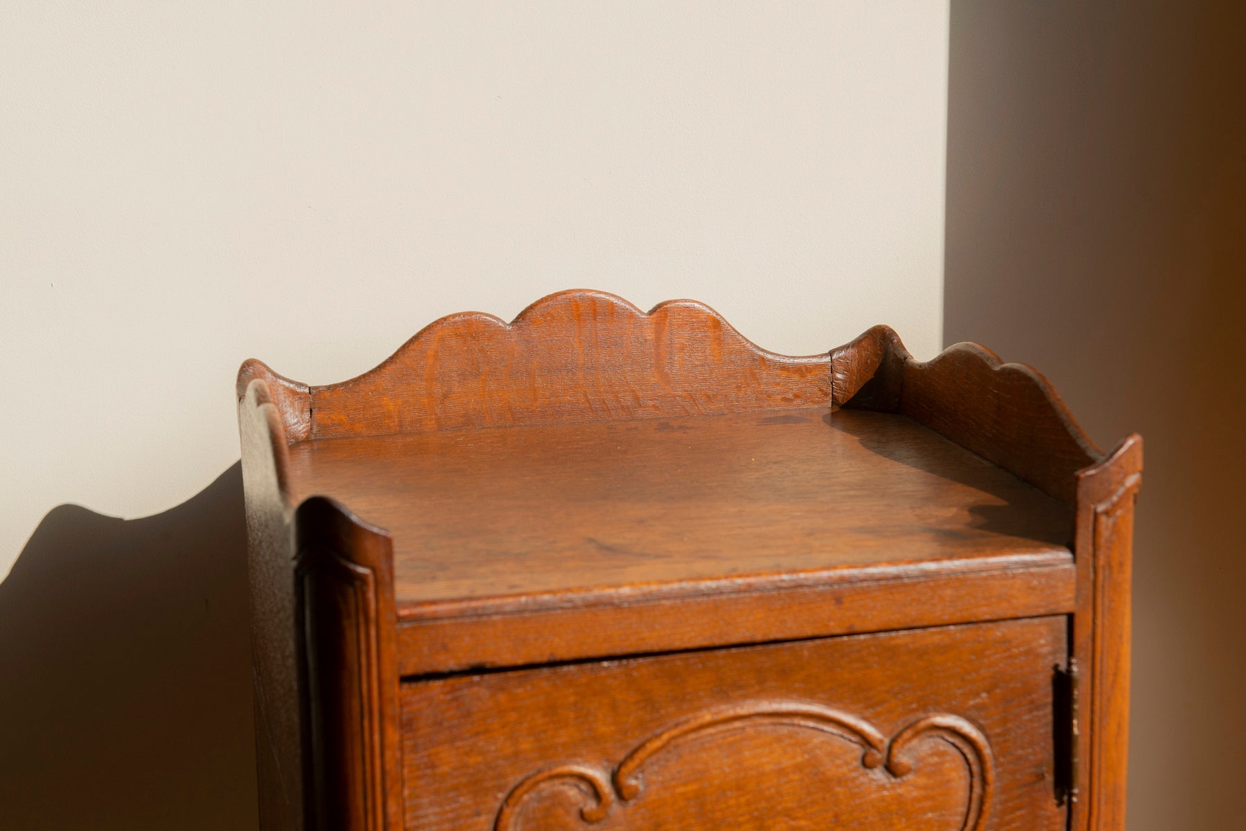Antique French oak cabinet with door and curved legs. This charming piece, dating from the early 1900s, was handcrafted in France. It features elegant curved legs, a scalloped top edge, and a beautifully carved detail on the door. Perfectly versatile, it can be used as a side table or bedside table. The oak wood shows only minimal signs of wear consistent with age. Overall, the cabinet is full of character and ready for immediate use!
