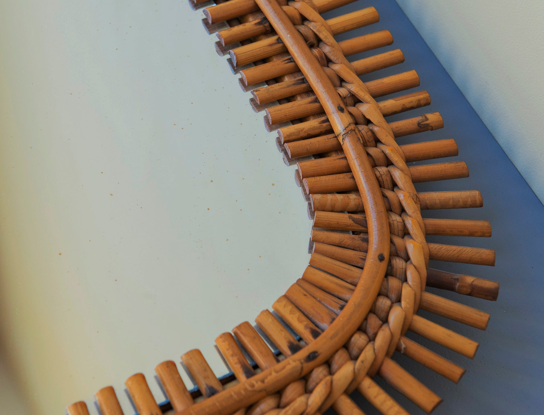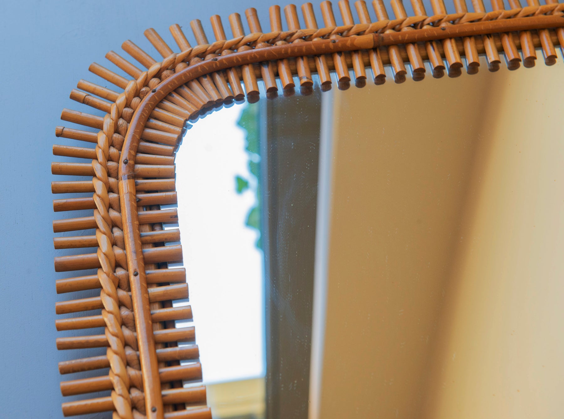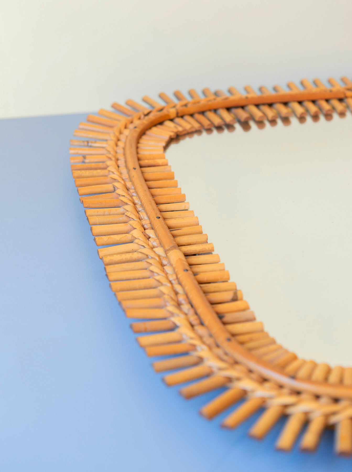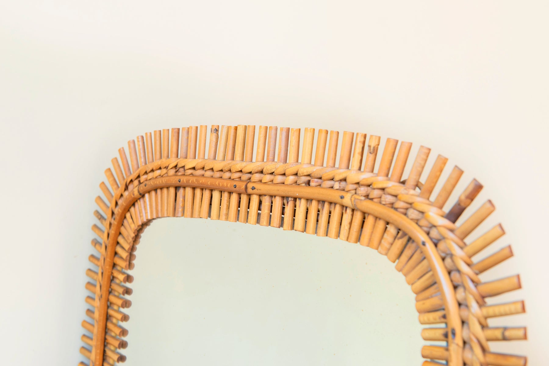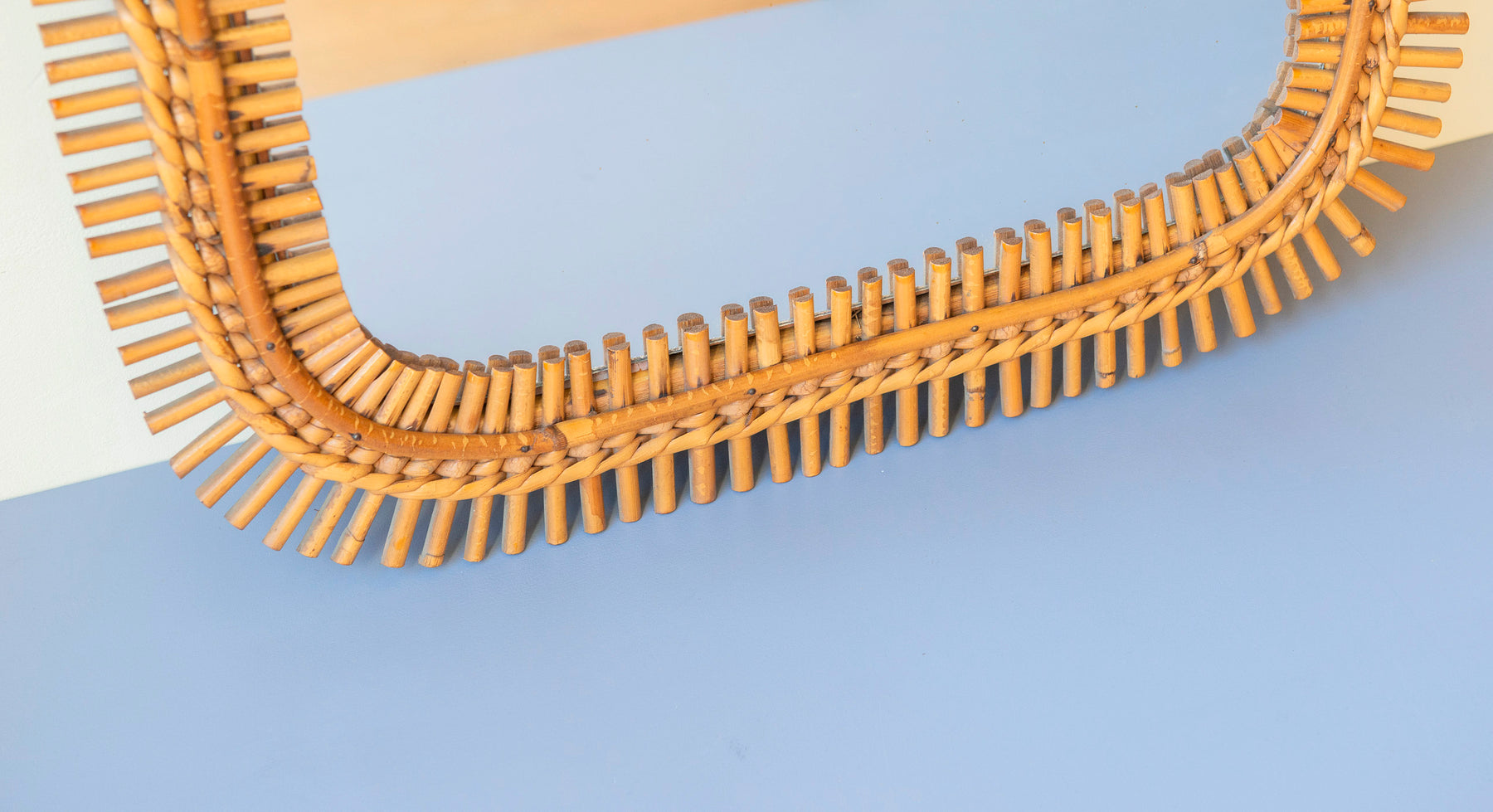 Please note: there are only minimal signs of wear on the frame and a natural patina on the glass, as shown in the final photos. Overall, the mirror is in excellent vintage condition and ready to hang. It comes with a velvet backing and two bamboo hooks for easy wall mounting.