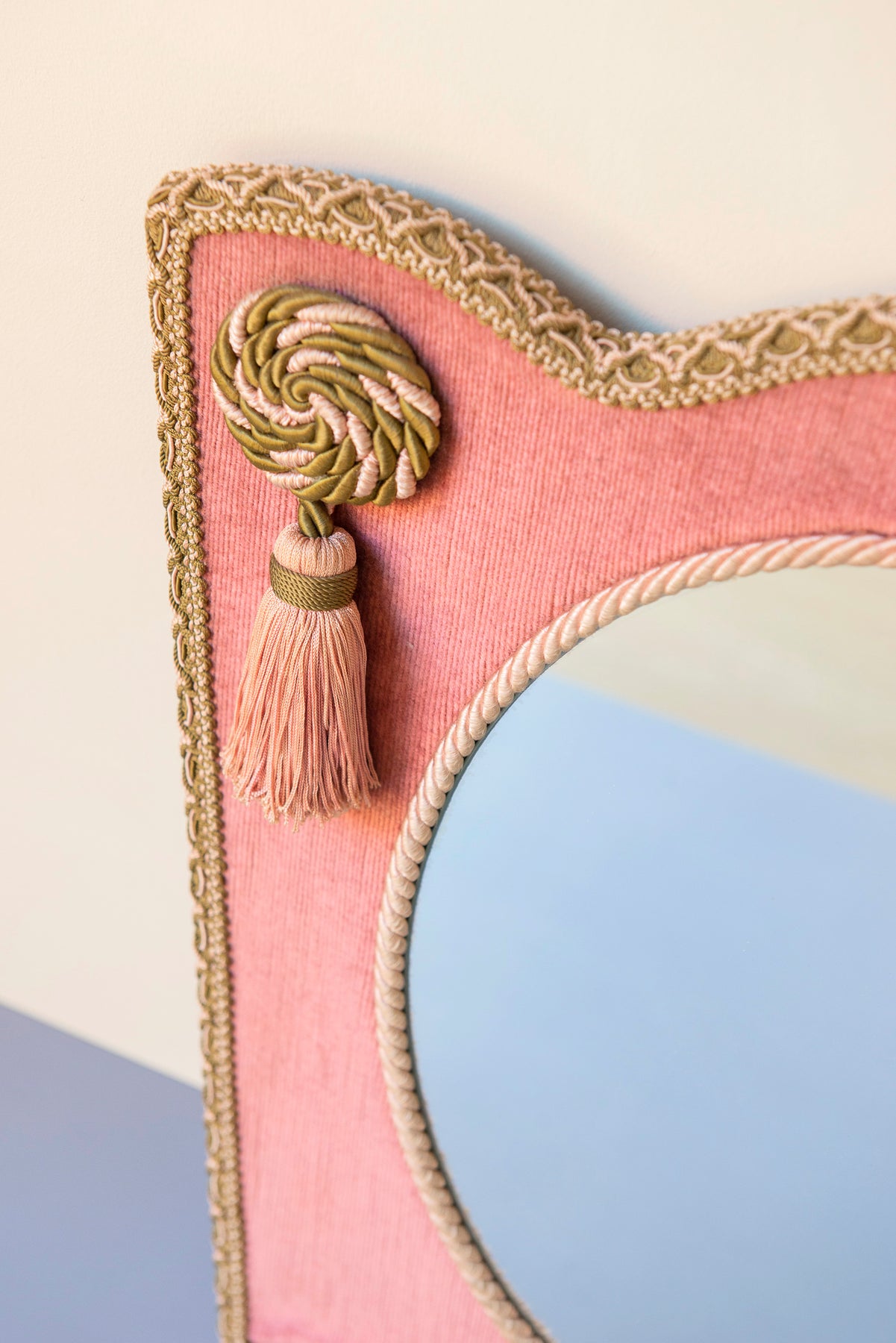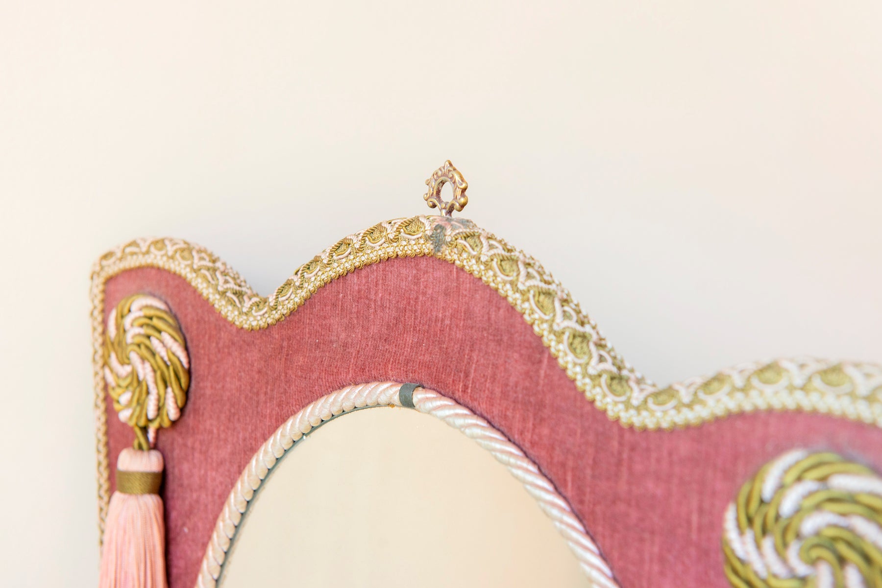 Lovely upholstered pink velvet wall mirror, featuring two tassels on the frame and decorative trimming along the edges.