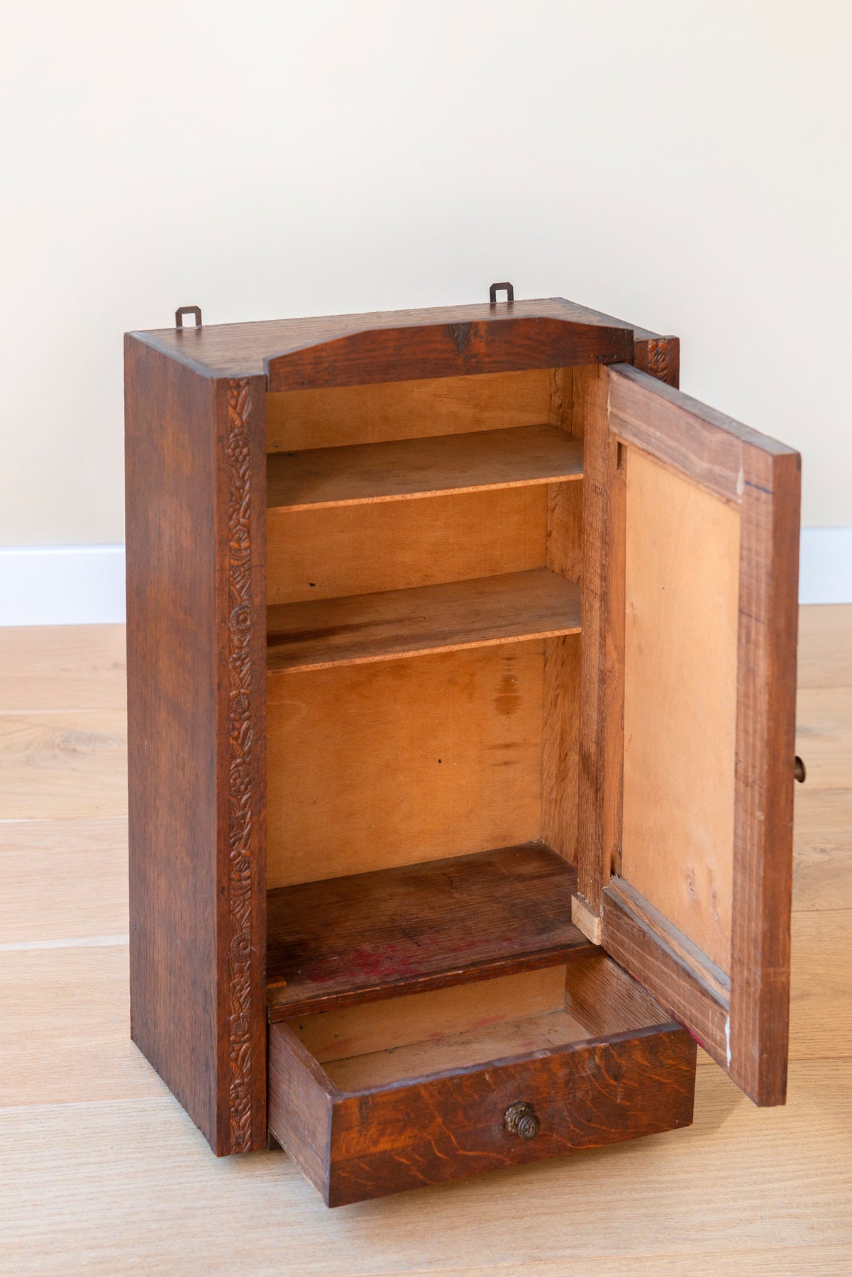Antique French Art Deco apothecary cabinet. A beautiful early 1900s French apothecary cabinet crafted from solid oak. This piece features elegant hand-carved details, charming metal door knobs, two interior shelves, and a convenient drawer at the bottom for additional storage. The cabinet is a lovely testament to the past, rich in character yet still highly decorative — a true vintage treasure that would make a stunning addition to any home. Please note: the mirror has acquired a natural patina over time, as shown in the final photo. The wood shows minimal signs of age and wear. Overall, the cabinet is in excellent condition and ready for use.