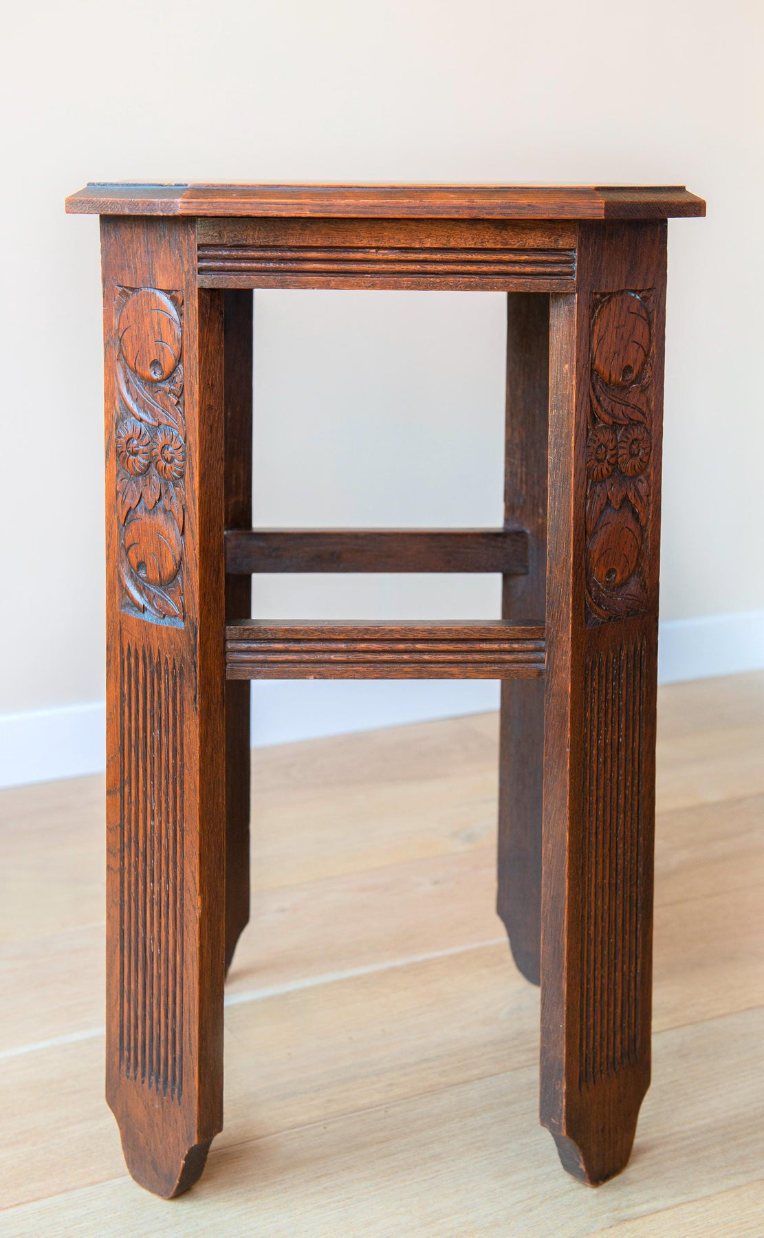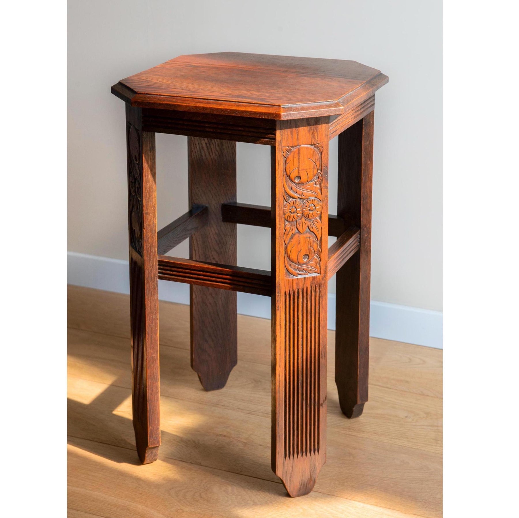 Charming Art Deco – Amsterdam School side table. This elegant side table is crafted from dark brown oak and features intricate hand carved details. The tabletop has an octagonal shape. A handmade Dutch piece from the 1930s, it serves beautifully as a side table or a stylish plant stand. The table is in excellent vintage condition, with only minimal signs of use on the surface.