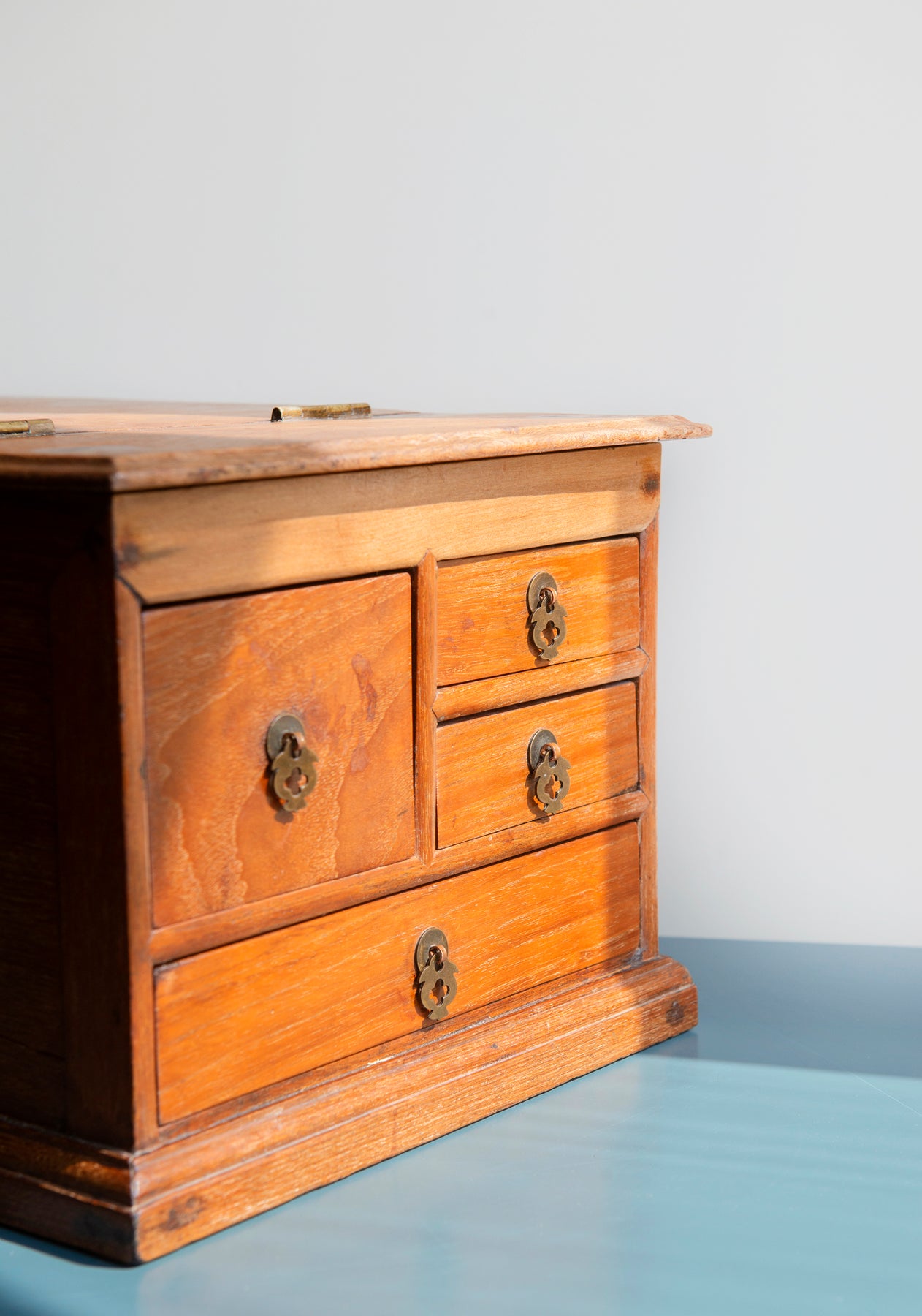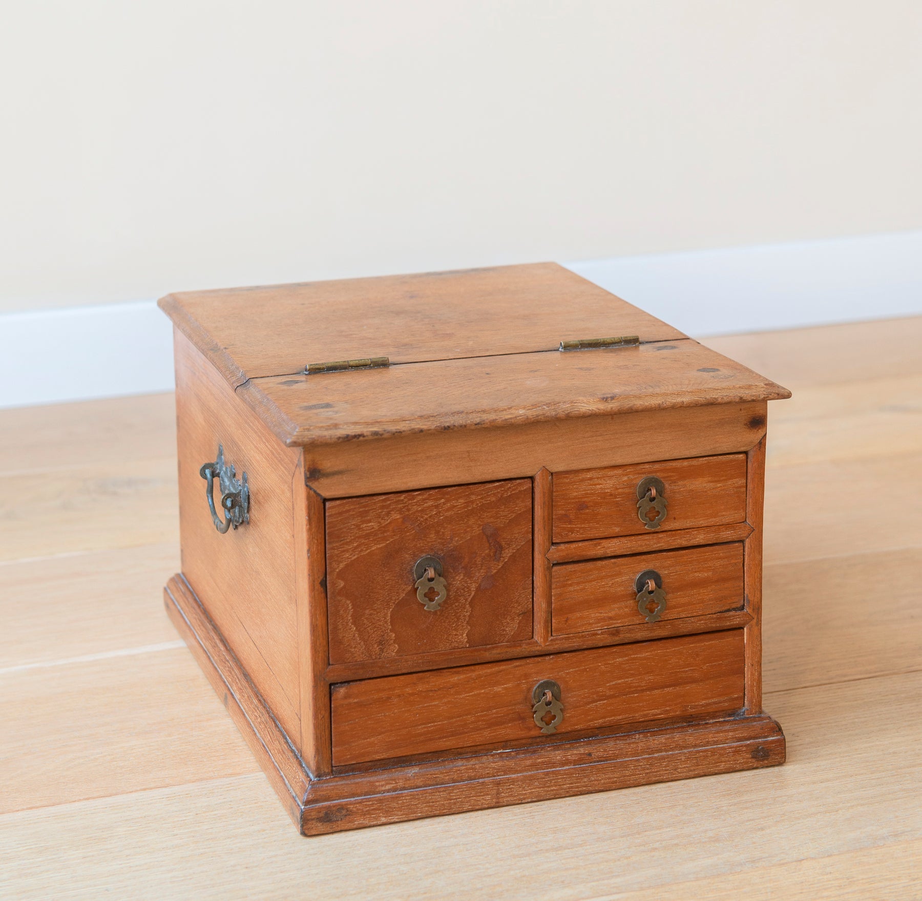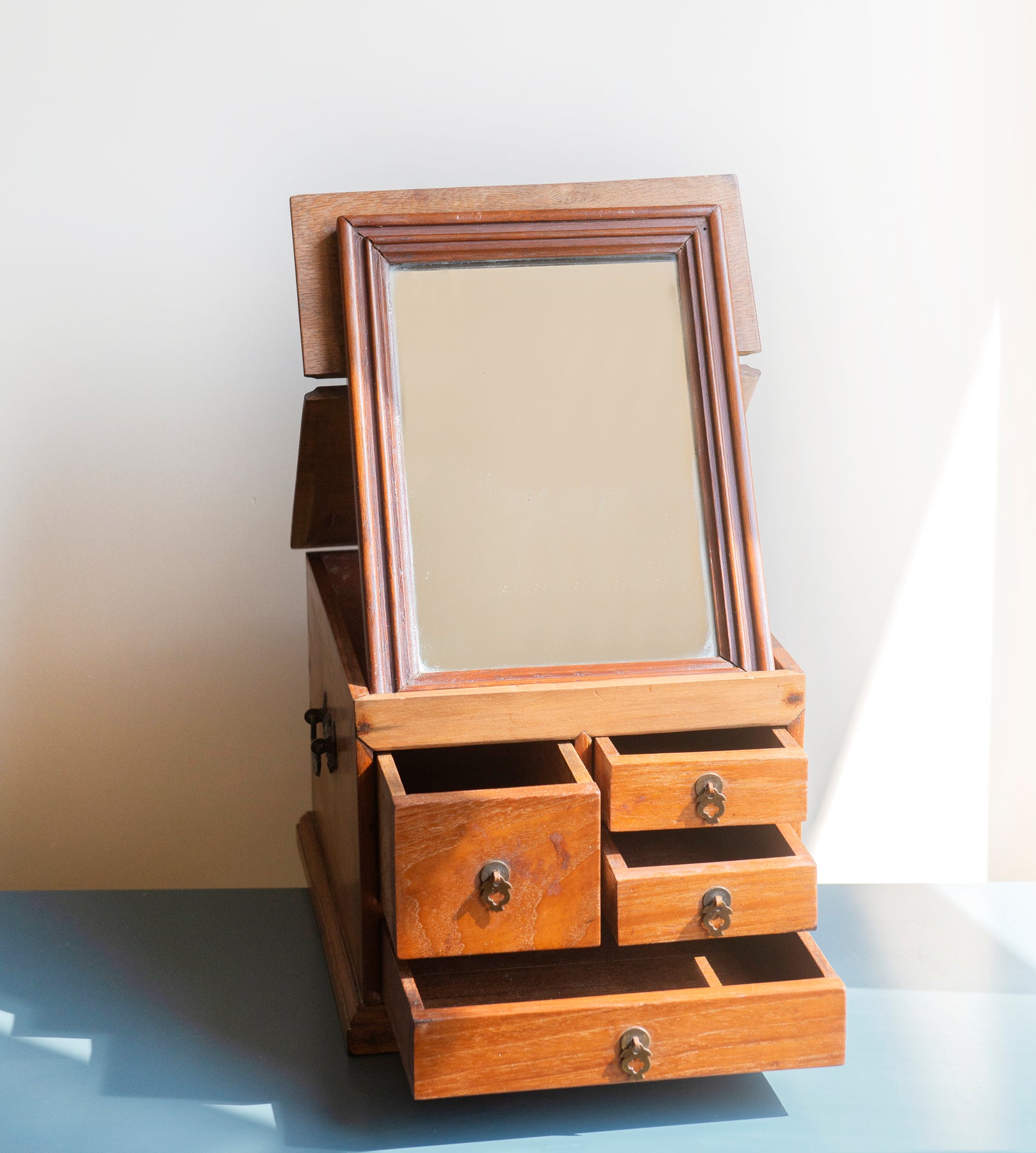 Charming antique solid oak chest with drawers and foldable mirror. This beautifully crafted antique chest is made from solid oak and features four drawers, offering plenty of practical storage. The top lifts open to reveal a foldable mirror, making it both functional and full of character. Whether used as a sewing box, for stationery, jewelry, kitchen spices, or other small treasures, this piece is as versatile as it is decorative. Adorned with elegant brass handles on both the sides and drawers, this cabinet is a lovely testament to traditional craftsmanship — note the finely made dovetail joints of the cabinet. The wood shows some signs of age and there are minimal traces on the glass. Overall, the cabinet retains all of its charm and is ready for immediate use.