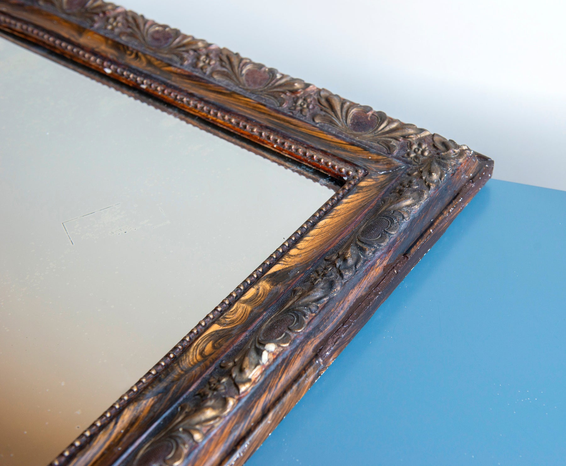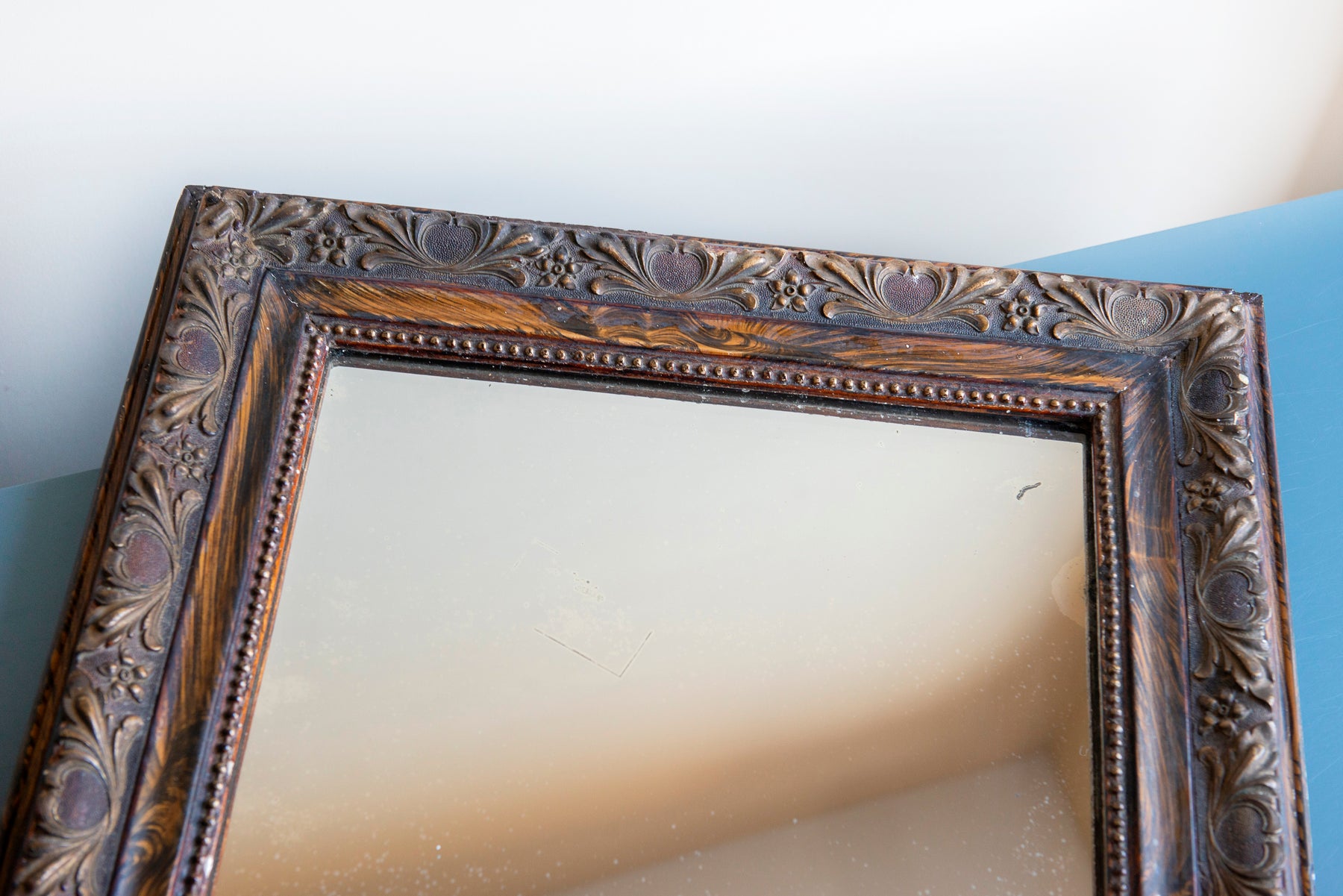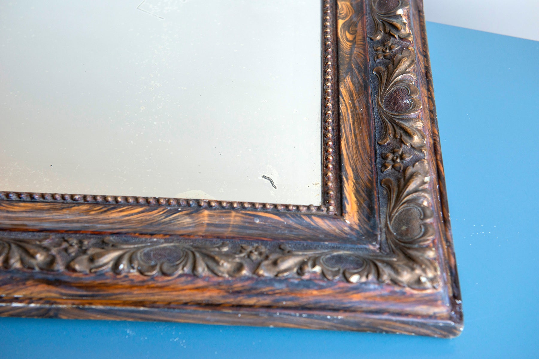Please note, the mirror has several traces of use. The mercury glass of the mirror has natural patina. There are several plaster chips on the frame and the last photo shows paint covering the damaged plaster. Overall, the mirror is still charming and is ready to use.