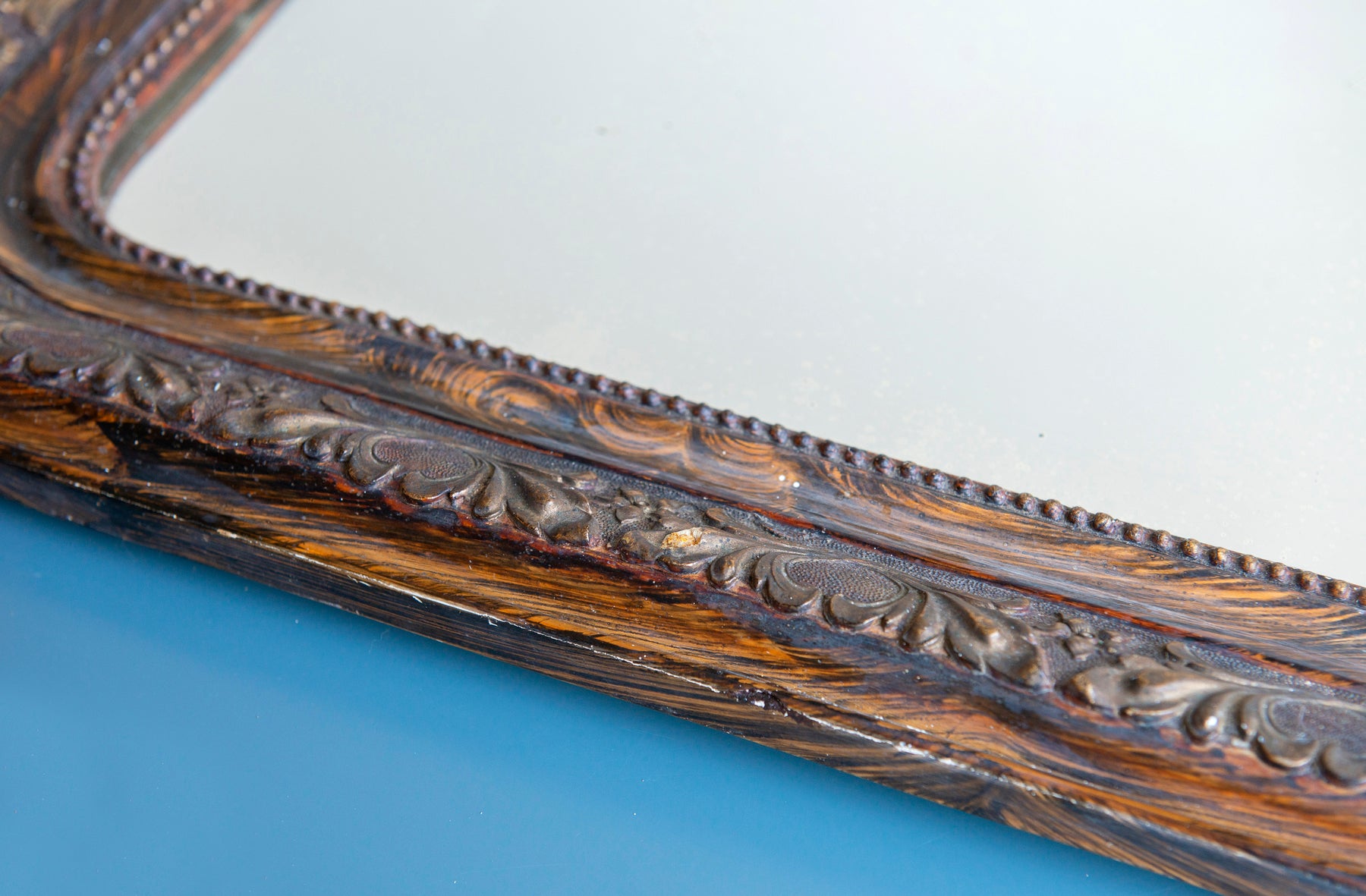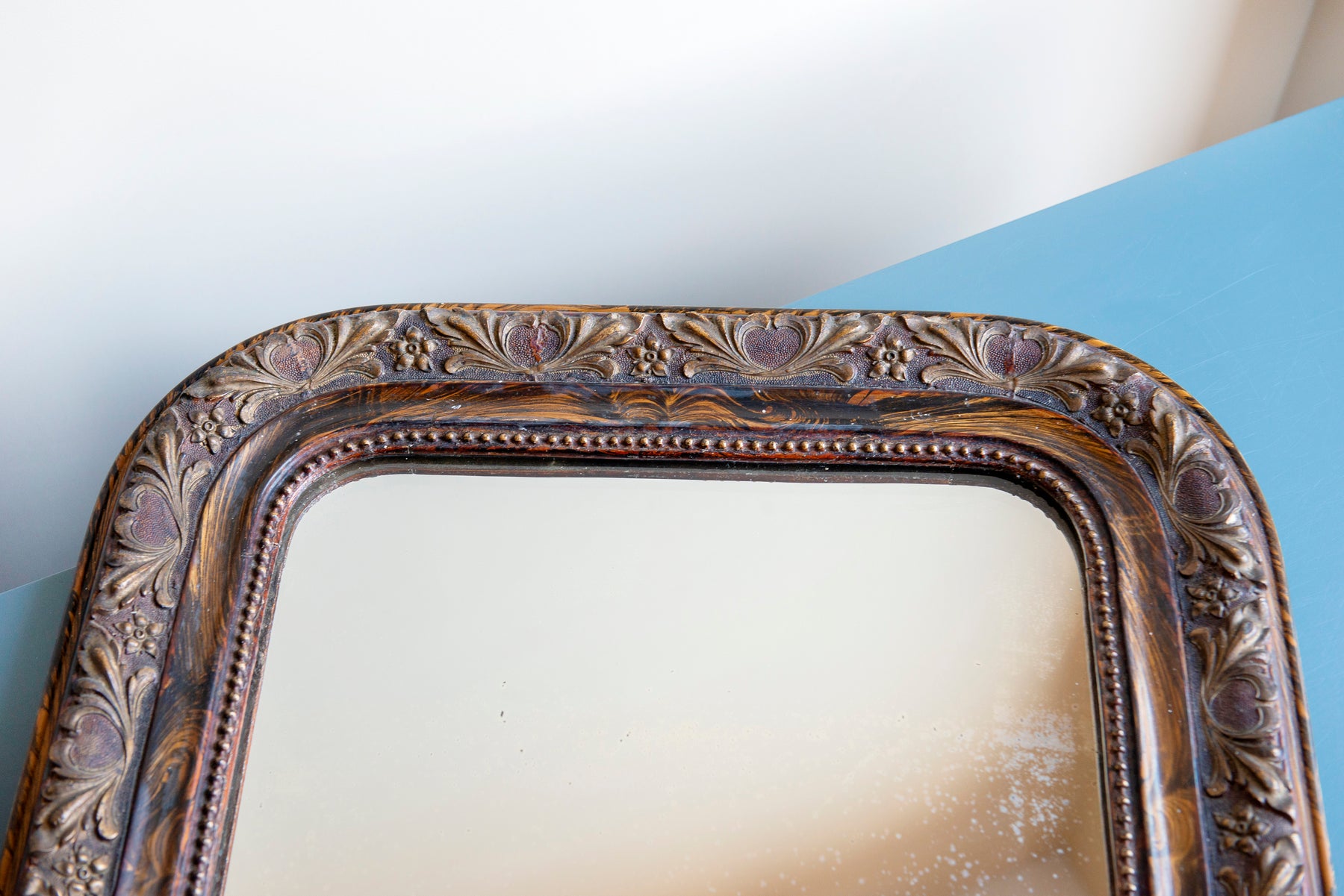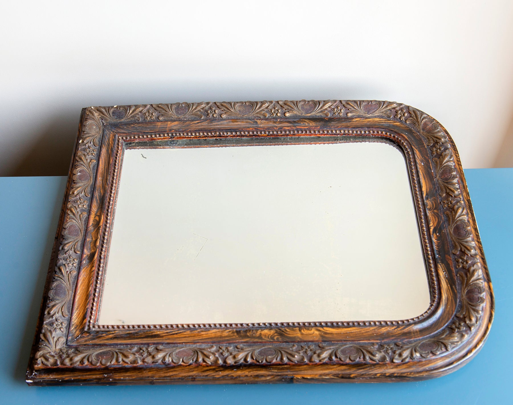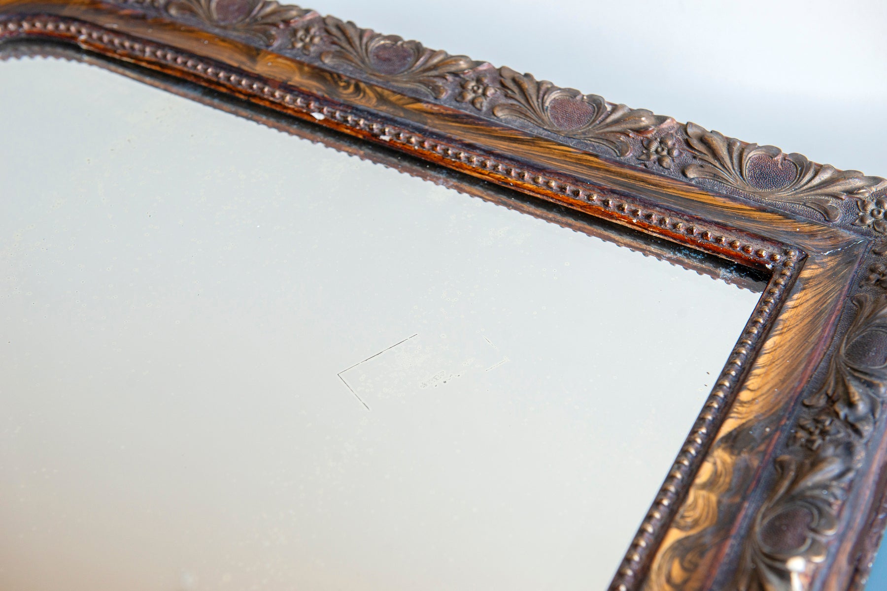 Please note, the mirror has several traces of use. The mercury glass of the mirror has natural patina. There are several plaster chips on the frame and the last photo shows paint covering the damaged plaster. Overall, the mirror is still charming and is ready to use.