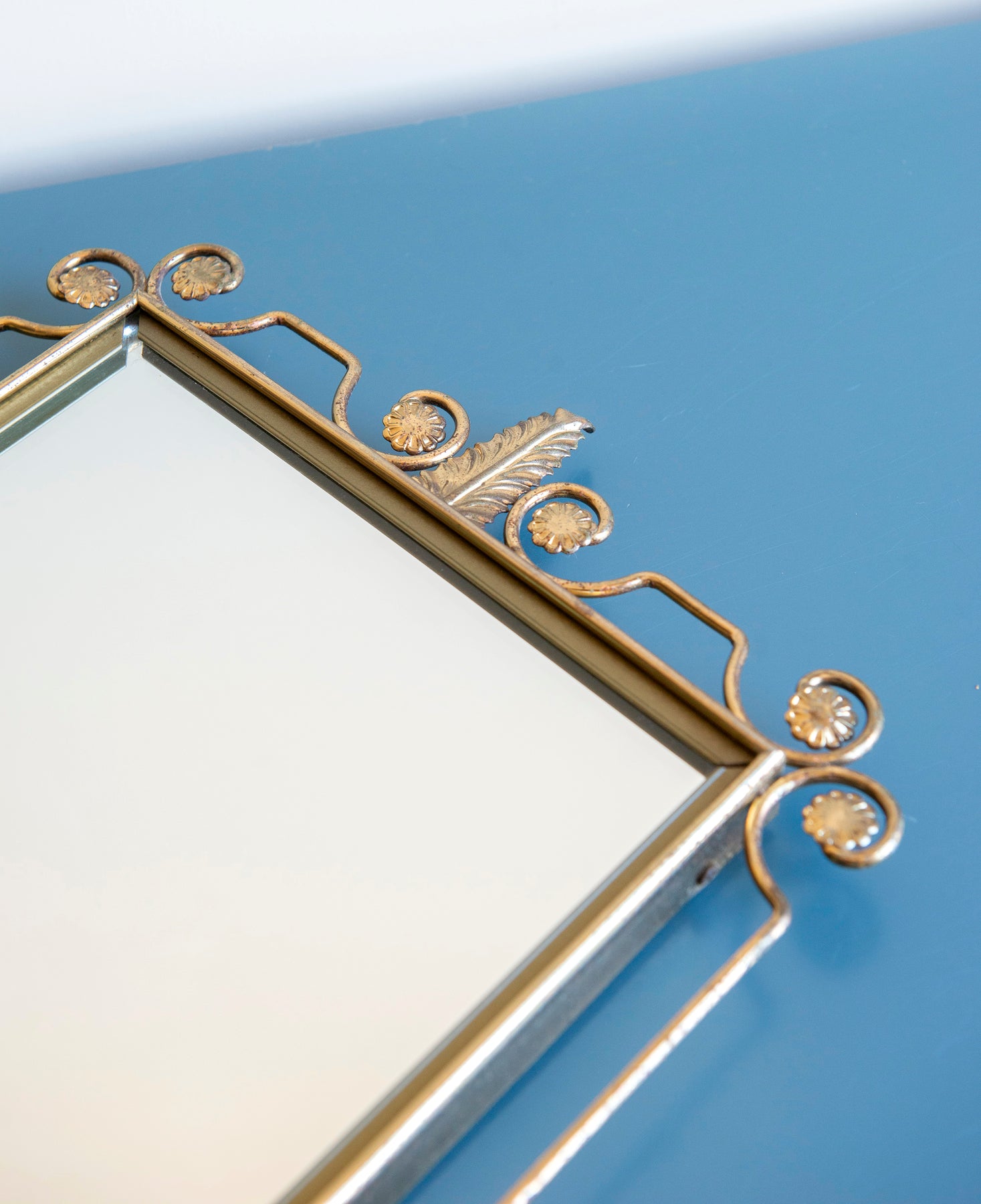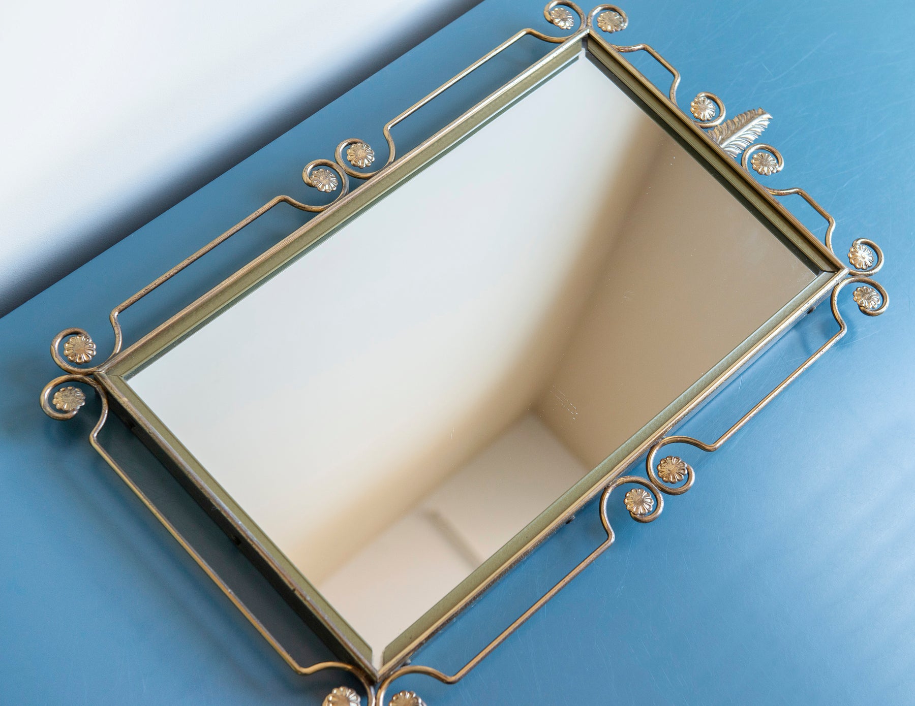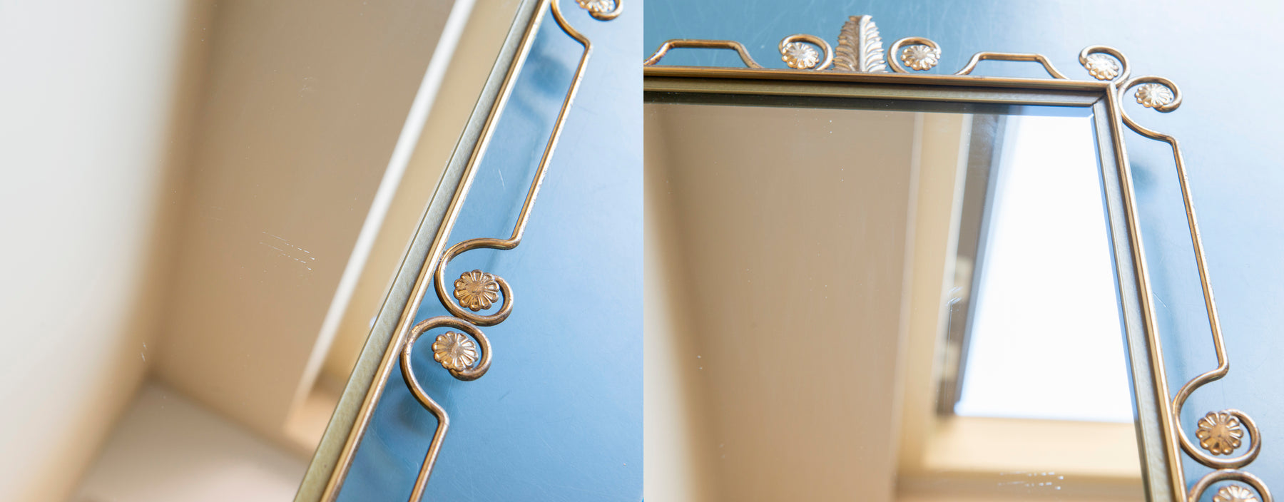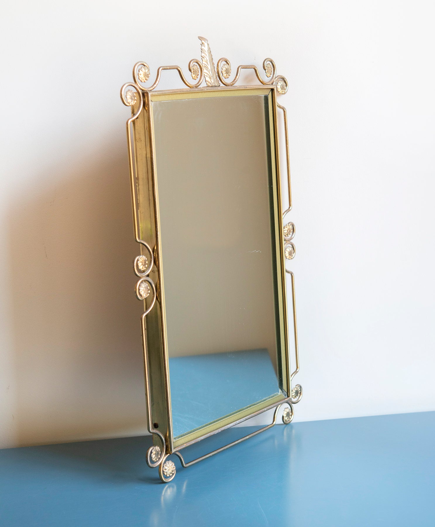 Please note there are small scratches and some patina on the glass and frame, as seen in the last pictures. Overall, the mirror is still in a good, vintage condition and ready to use!