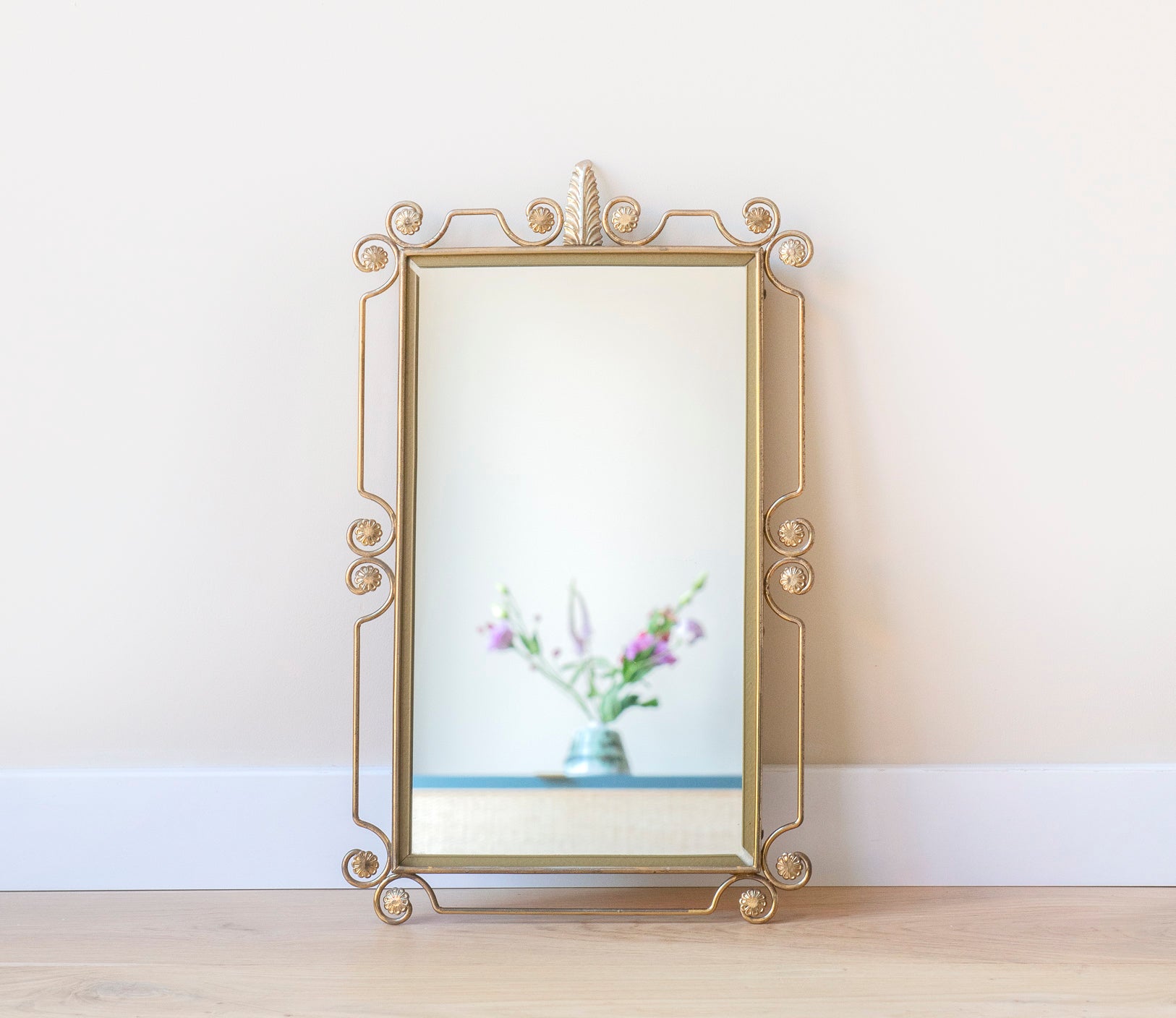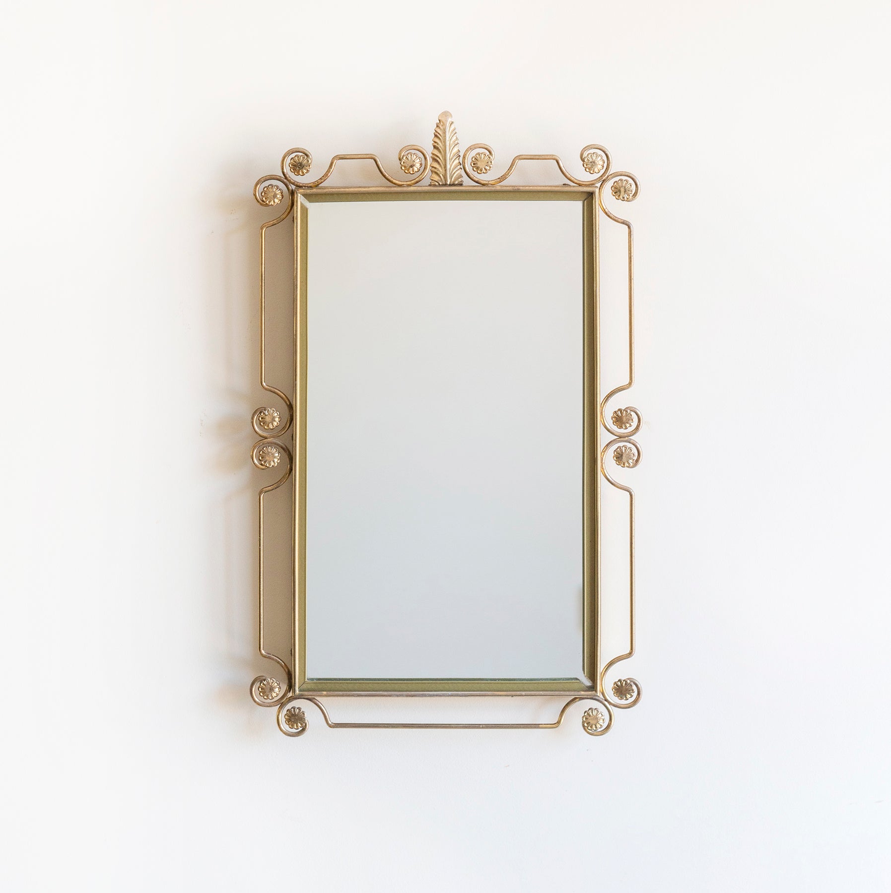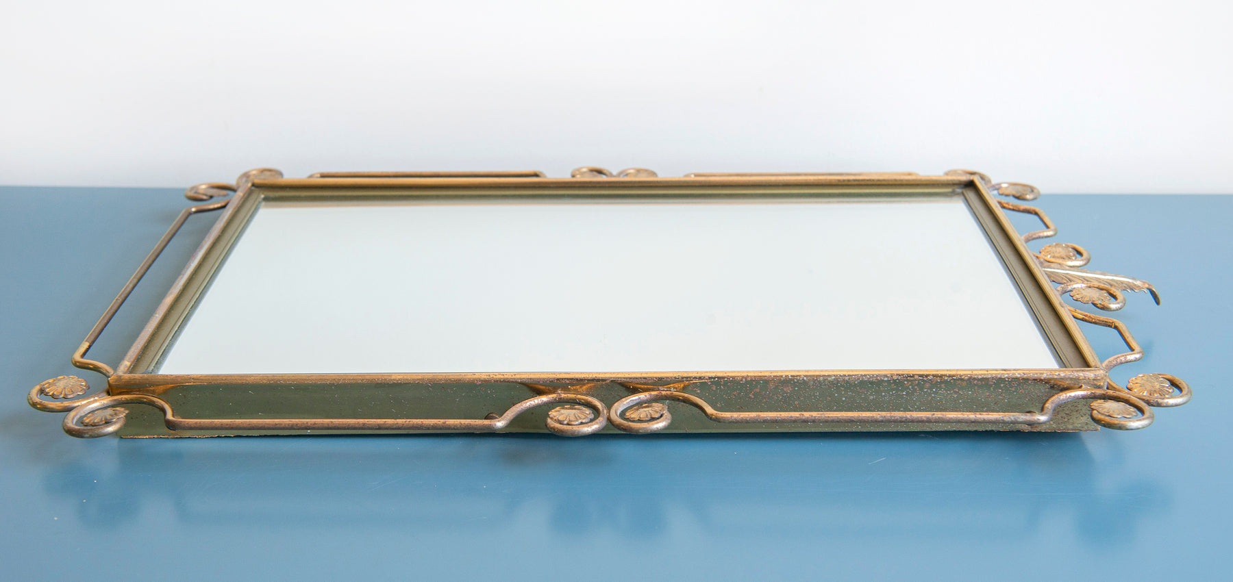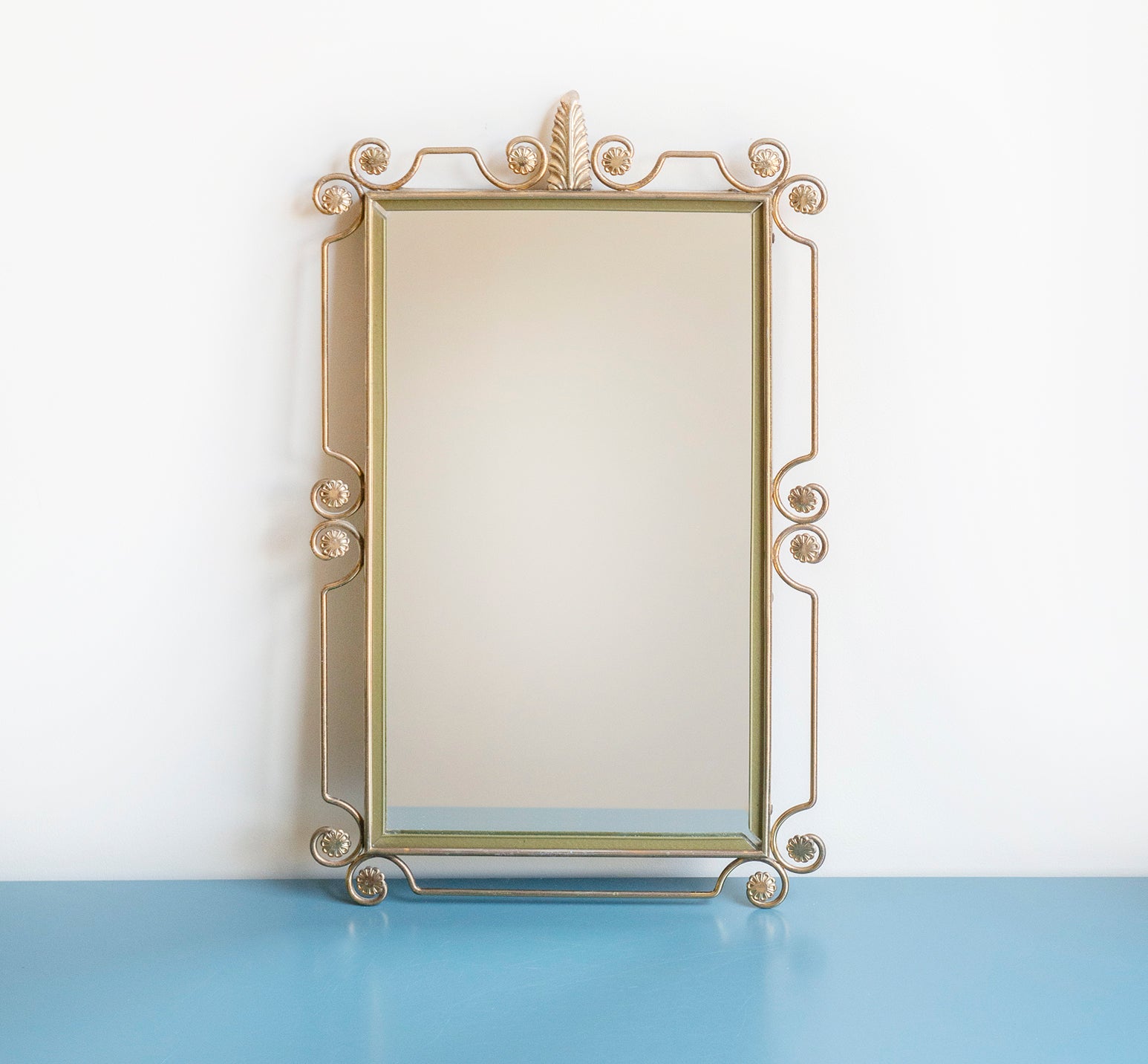 Please note there are small scratches and some patina on the glass and frame, as seen in the last pictures. Overall, the mirror is still in a good, vintage condition and ready to use!